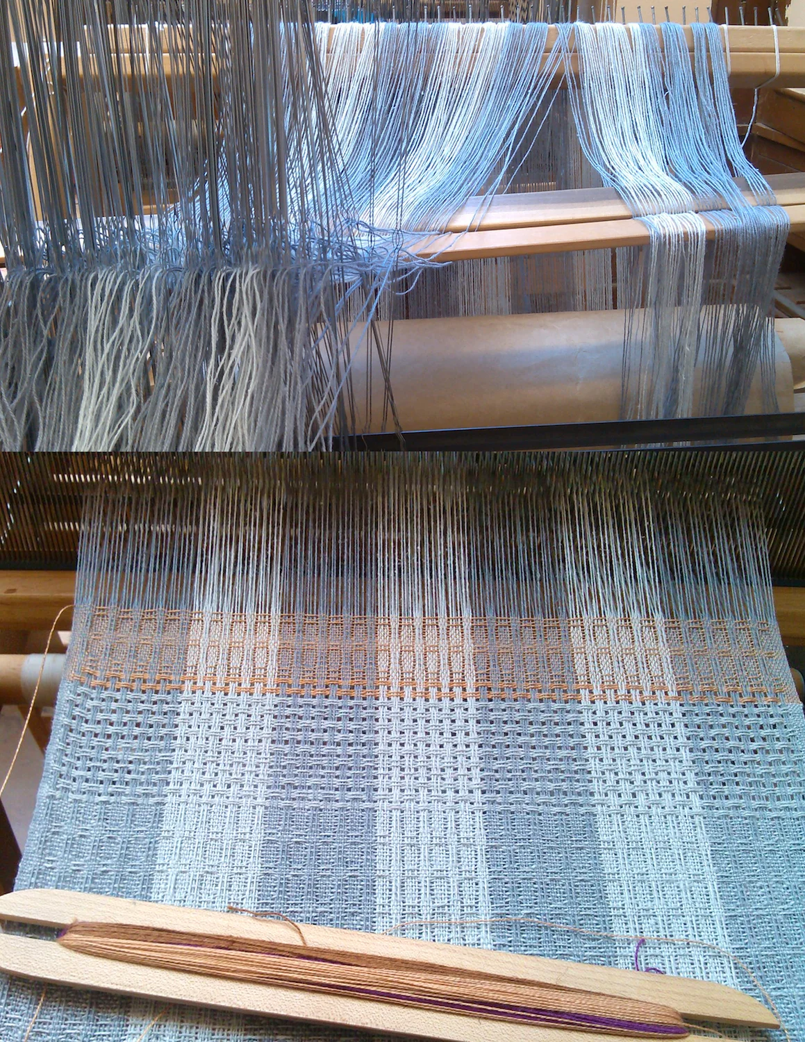 This technique can have two or more warps and one or more wefts. The pink/gray sampler has two warps (dyed) and has varying weft counts and designs. The peach/white project is an investigation of a double-faced cloth with two warps and one weft.